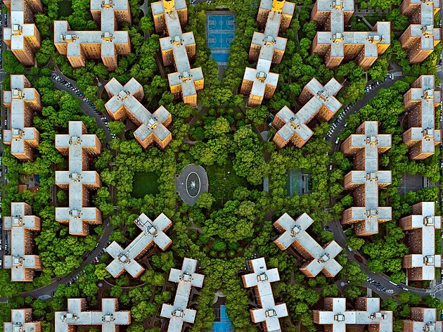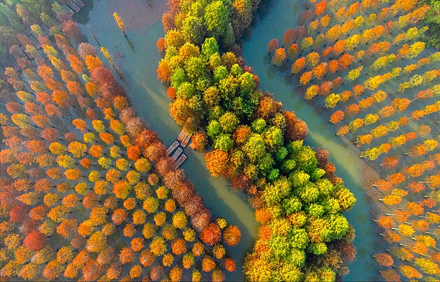Rozlehlé lesoparky v Číně na podzim nabízejí úchvatné výhledy na barevnou hru přírody a shora je pohled možná ještě kouzelnější.