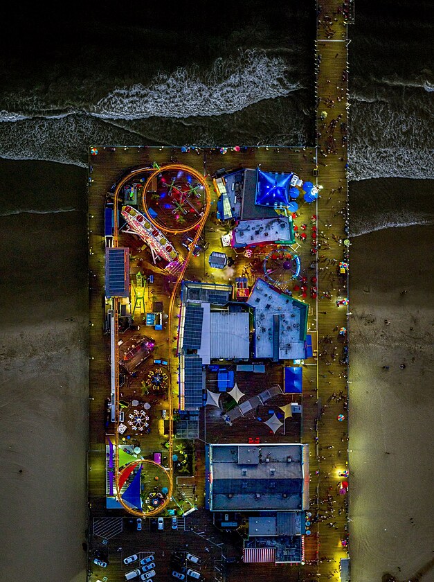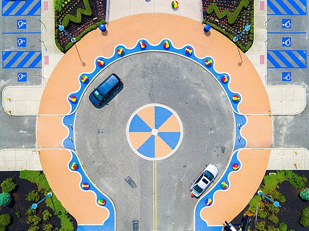 Kruhový objezd může při pohledu shora připomínat lízátko. Tento se dotýká okraje plážové promenády ve Wildwoodu v americkém New Jersey.
