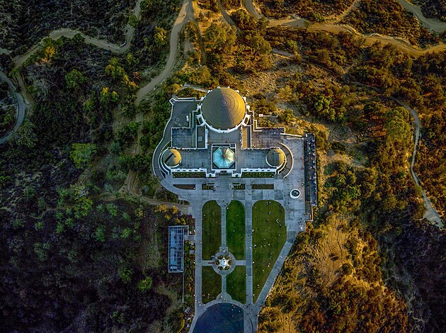 Griffithova observatoř v Los Angeles vypadá při pohledu z výšky jako malé vesmírné středisko.