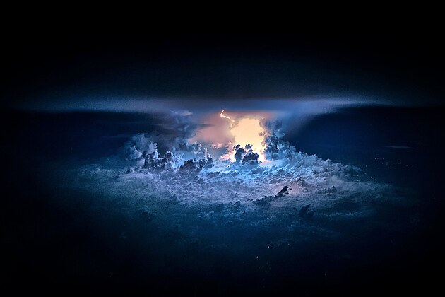 Bouřku osvětlující vnitřek mraků ukazuje fotografie pořízená z kokpitu letadla.