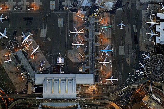 Snímek zachycuje newyorské letiště JFK v plném provozu při pohledu shora
