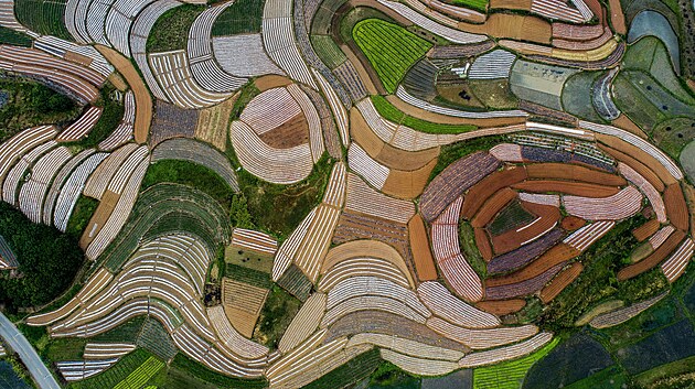Jako barevný obraz, který leží na zemi, vypadá pěstování zeleniny v čínském městě Pumiao