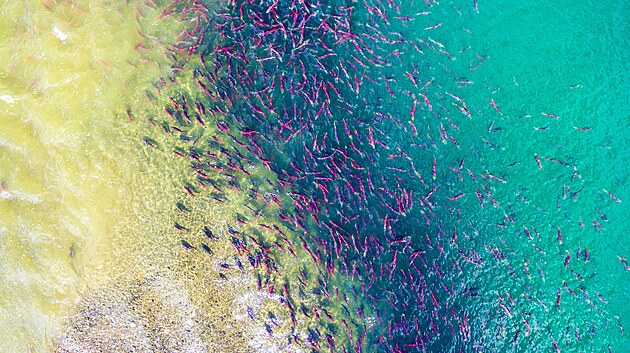 Letecký pohled na lososy připravující se k tření v ruském jezeře.