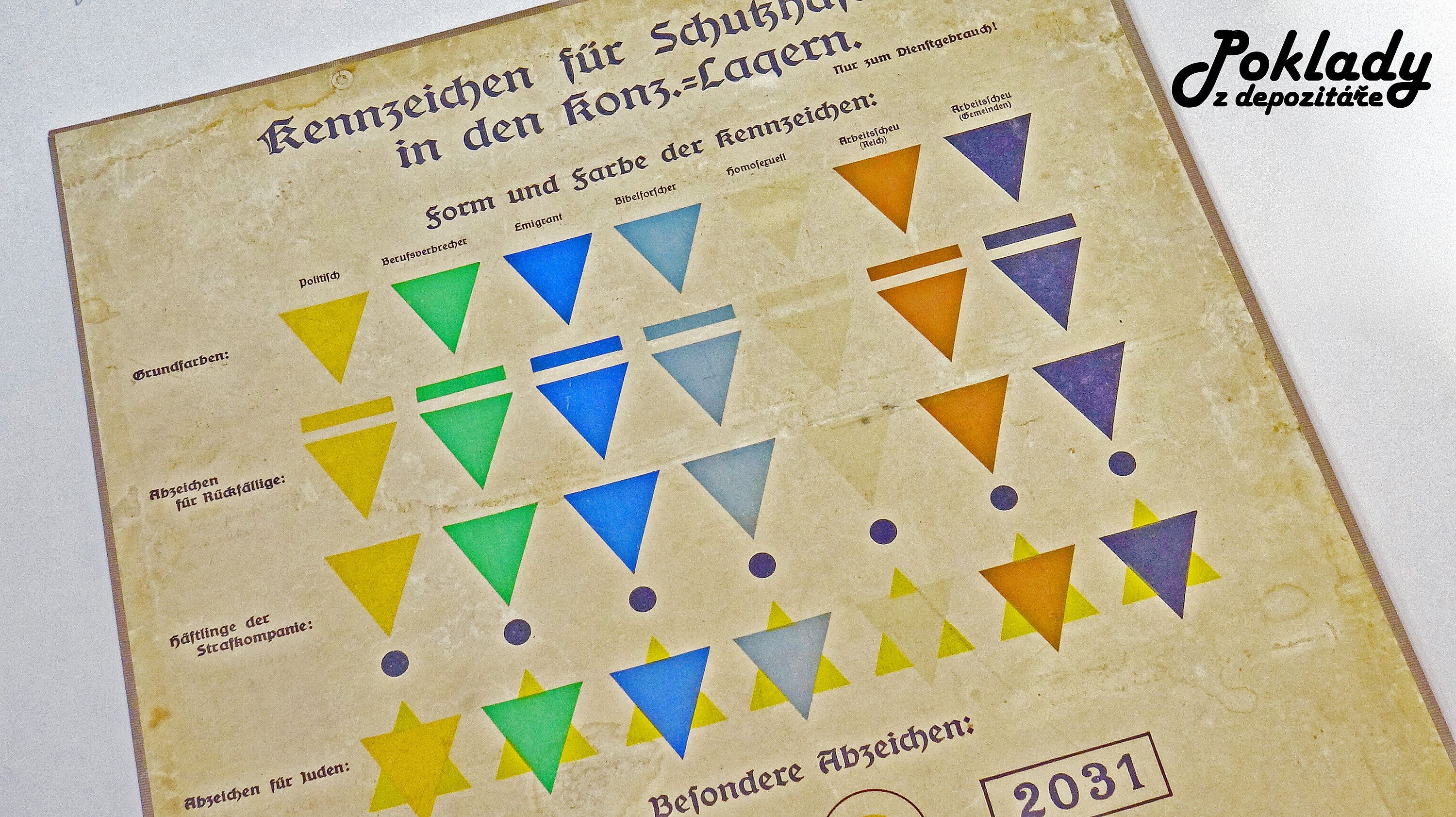 Sledovat další díly na iDNES.tvTabulka zpočátku 40. let 20. století zahrnuje celkem 11 rozlišovacích prvků vězňů koncentračních táborů. Vězni museli na šatech nosit látkový trojúhelník, jehož základní barva umožňovala dozorcům okamžitě poznat základní důvod pobytu v tzv. „ochranné vazbě“.