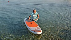 Zaro paddleboard jsme nezkusili nikdy, nelákalo nás to, ač jsme k moři jezdili často a „PB“ se tam daly snadno půjčit. Používali jsme ale dost matračky a ani na ní není úplně snadné vylézt. Když se na ní člověk položí a vypluje na mělčině je to pohoda. Ale když z ní o kus dál sklouzne, vyšplhat se zpět v místech, kde šlapete vodu, už bývá podobně zábavný pohled jako na „PB“ u Ygy v albu.