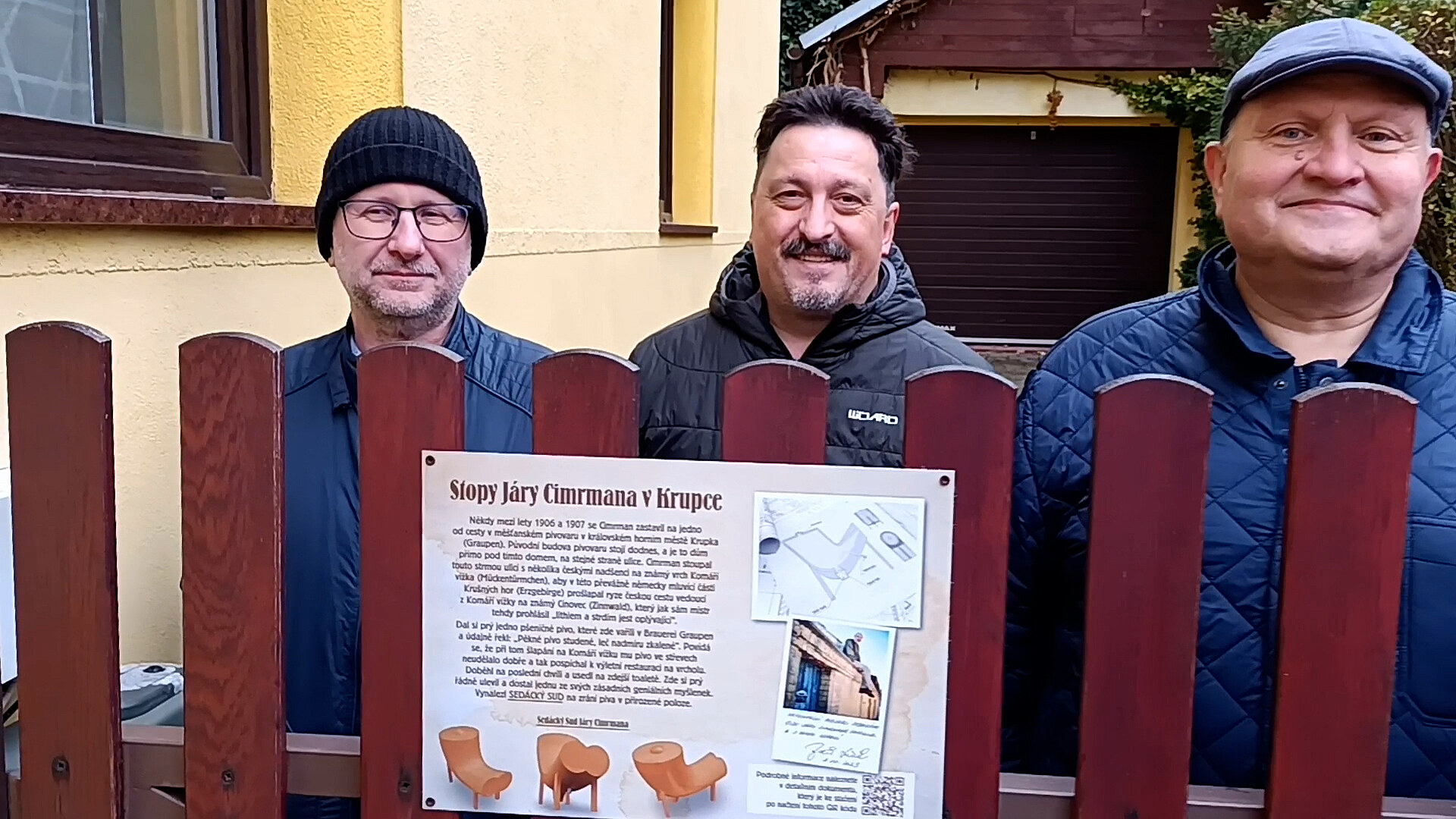Cimrman tehdy stoupal s několika českými přáteli strmou krupskou ulicí směrem na Komáří vížku a v dnes již bývalém pivovaru, naproti němuž je nyní umístěna pamětní cedule, se tehdy zastavili na „jedno od cesty“.