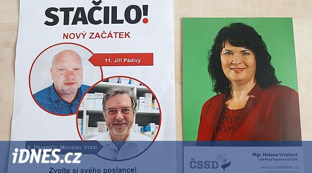 A na druhém letáku, který si zhotovil její manžel, brtnický lékárník Miloslav Vrzal, je logo Stačilo! Za něj jako člen KSČM Vrzal kandiduje. Z jeho letáku je zřejmé, že by byl rád, kdyby ho na šestém místě kandidátky voliči zakroužkovali.