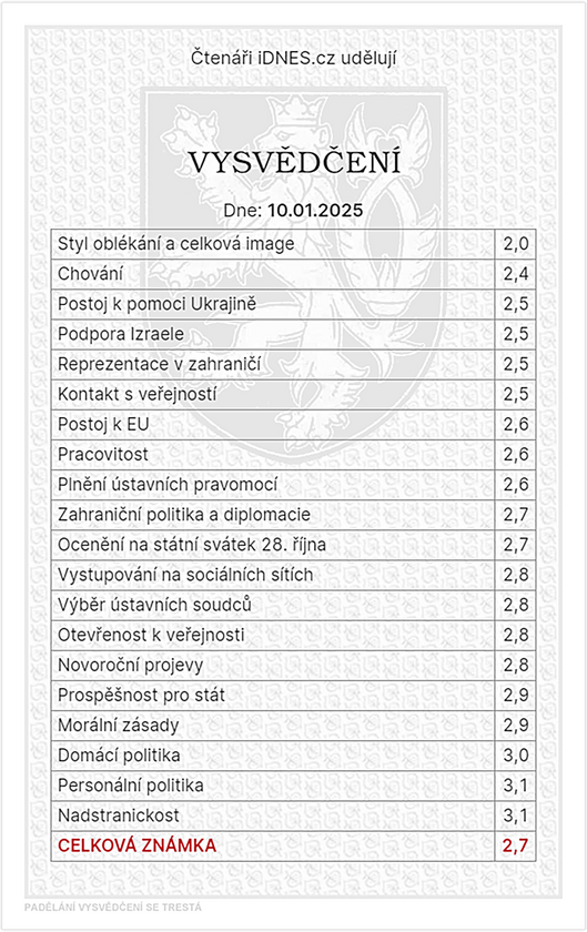 Celková průměrná známka prezidenta Pavla ze všech „předmětů“ od čtenářů je 2,7. Ani v jednom předmětu u lidí, kteří známkovali, hlava státu nepropadla.