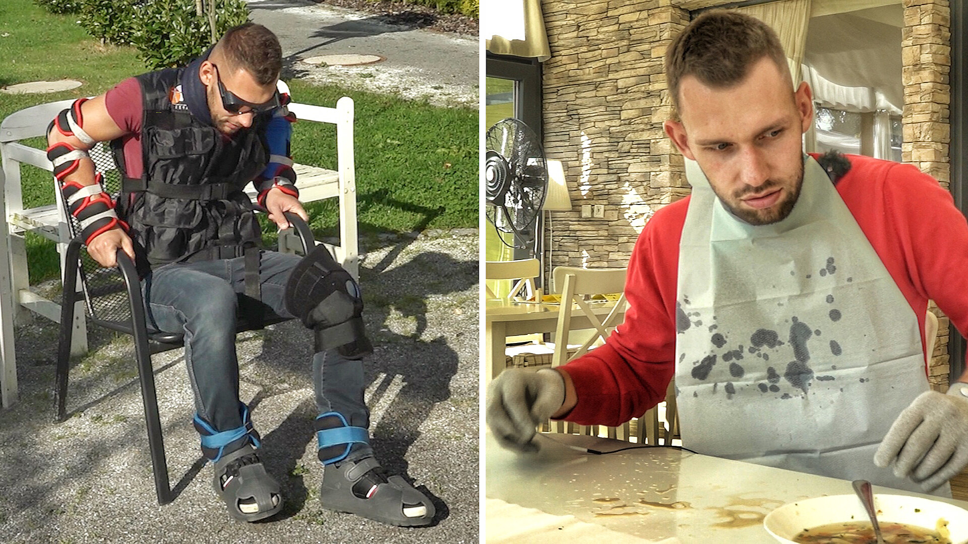 Sledovat další díly na iDNES.tvOblek je tvořen spoustou závaží umístěnými na trup, ruce, nohy i krk, dále nákoleníkem s bodci či brýlemi, přes které je vidět tak desetina „normálního obrazu“.