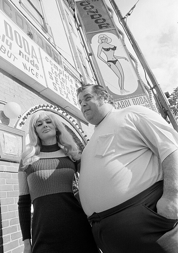 „Měla velmi traumatické dospívání a absolutně nevěřila lidem, mužům zejména,“ vzpomínala na ni někdejší sanfranciská tanečnice Marsha McGovern. „Milovala pozornost, potřebovala ji. Nemyslím, že se jí dostalo času na dospívání.“ Na snímku je Carol Doda s autorem nápadu s monokinami před klubem Condor.