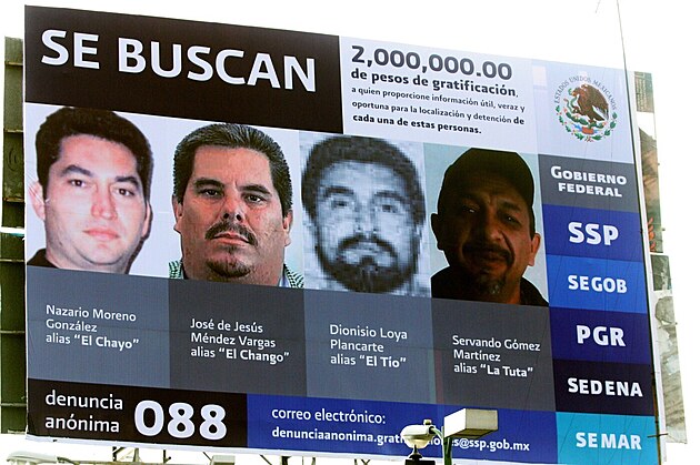 Kartely však neobnášejí jen násilí a sofistikovanou strategii. Nabízejí i bizarní normy, ideologie, víru. Kartel La Familia Michoacana vedl Nazario Moreno Gonzáles (první zleva) jako náboženskou sektu, členům rozdával vlastní „bible“. V chudých komunitách se snažil vystupovat jako „svatý“, ochránce, muž charity.