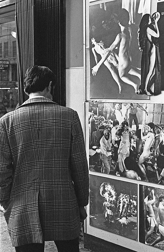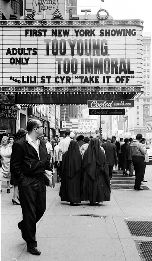 Jindy zachytil objektiv pod poutačem hlásajícím „Tak mladá, tak hříšná“ nezúčastněně jdoucí jeptišky.