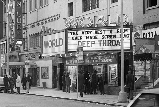 Toto je New Mature World Theatre. Ikonický porno svatostánek, právě ten v roce 1972 uvedl Hluboké hrdlo. Mimochodem, o deset let později se odhalilo, že kino vlastnila ctihodná finanční skupina Rockefeller Group. Do zlatého dolu porna se chtěl ponořit každý.
