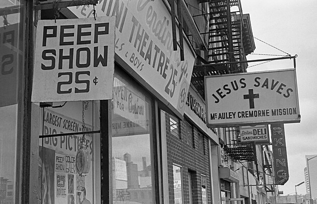 Rozporuplných výjevů nabídlo porno tažení spoustu. Další z legendárních podniků Adult Mini Theater sousedil s křesťanským centrem, jehož poutač sliboval, že Ježíš zachraňuje.