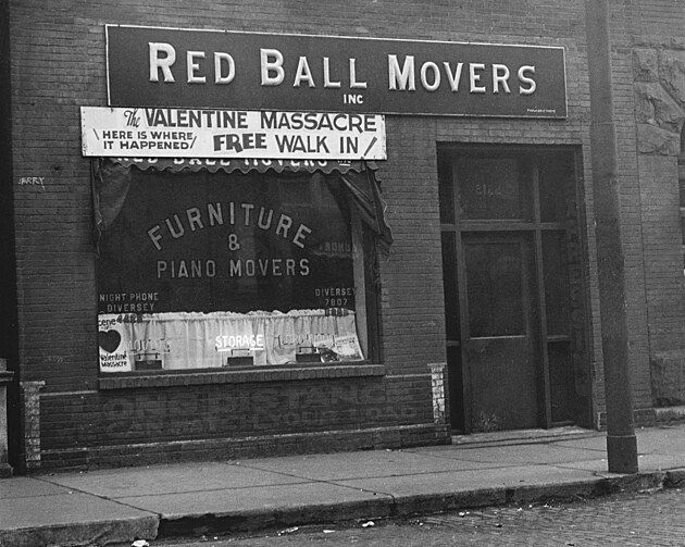 A toto je fotka místa činu. Sedm obětí, buď byly součástí zločinecké organizace North Side Gang, nebo se motaly kolem ní, bylo popraveno metodicky, pečlivě.