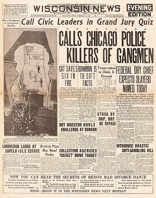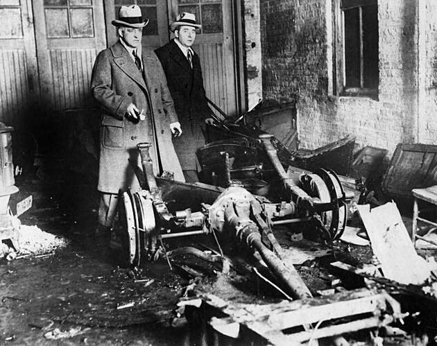 Na závěr se ještě vrátíme do chicagské garáže. Abychom připomněli přeživšího svědka masakru – pejska Highballa. Patřil Mayovi a jatka přestál uvázaný u auta. Policisté (na snímku obhlížejí místo činu) ho našli živého. Nakonec se stal obětí masakru i on. Podstoupil takové trauma, že ho policie musela nechat utratit.
