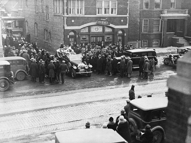 Tato fotka je z pohřbu bratrů Gusenbergových. Jistě můžeme počítat, že většinu lidí, kteří se s nimi přišli rozloučit, pojily s gangem North Side více nebo méně pevné nitky.