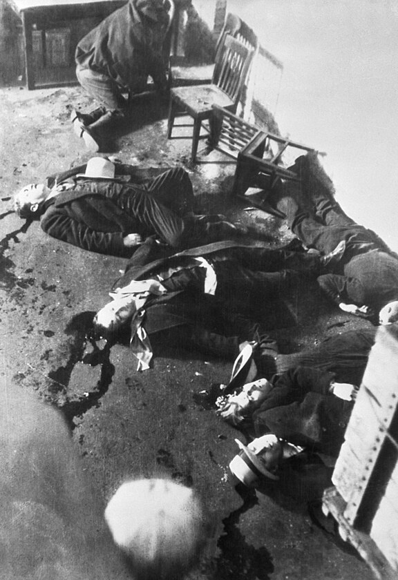 Kati je při předstírané policejní razii postavili ke zdi, střelami je pokropili ve třech vlnách: směřovaly na hlavy, hrudníky, břicha. Sedmdesát výstřelů ze samopalů, jedna z brokovnice. Další rány z brokovnice pro jistotu. Tak výjev zachytil list The Chicago Tribune.