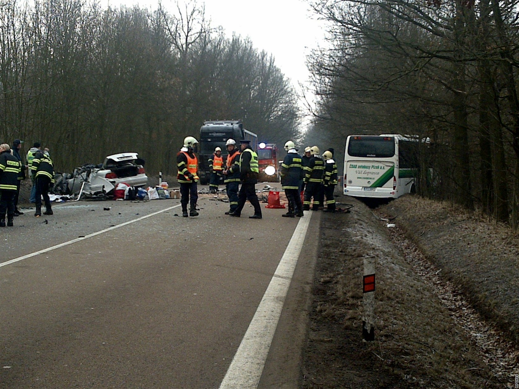 "Osobní automobil BMW se zde čelně střetl s autobusem, který sjel mimo vozovku. Auto se roztočilo a zůstalo částečně na silnici, je ale zcela zdemolované," uvedla mluvčí hasičů Alena Marešová. V osobním autě zemřeli podle policie dva muži ve věku 35 a 40 let a 22letá žena. Auto řídil mladší z dvojice mužů.