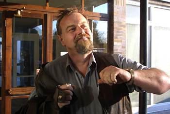 Profesor univerzity v Hradci Králové ukazuje naražený loket. Zranil ho student, který ho napadl v pracovně, 8. prosince 2003 |