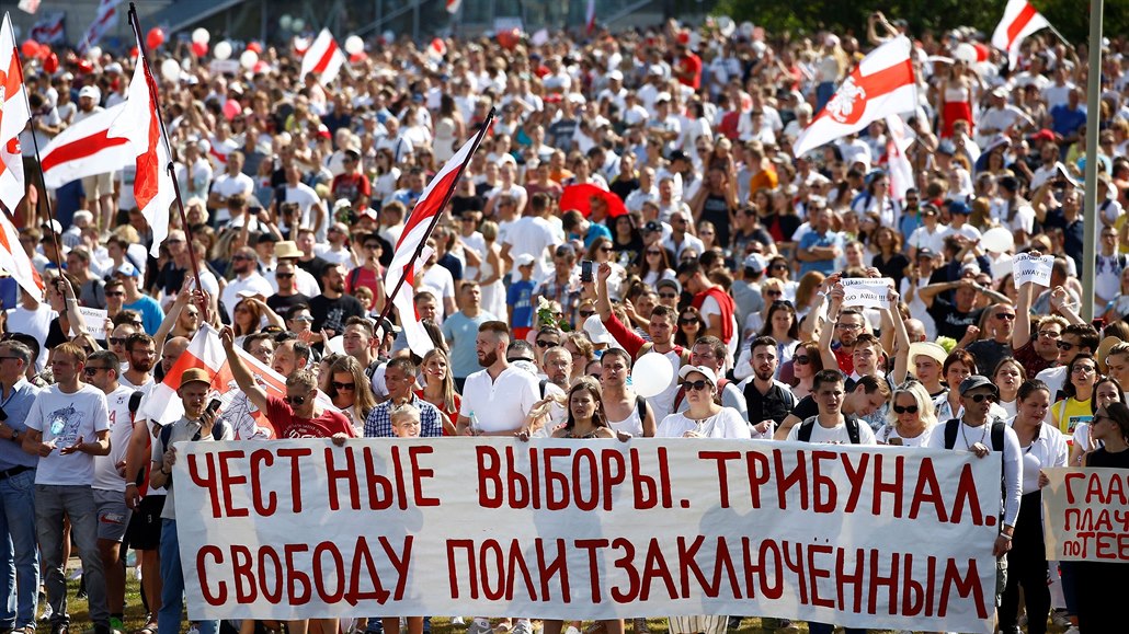 Na dosud největší demonstraci v Bělorusku se v neděli sešlo podle odhadů až 200 tisíc lidí, do stávky vstoupily tisíce zaměstnanců státních podniků. Opoziční protikandidátka Svjatlana Cichanouská, která podle oficiálních výsledků získala přes deset procent hlasů, z litevského exilu vzkázala, že je připravena se postavit do čela národa. Také vyzvala Evropskou unii, jejíž hlavy států a vlád se videokonferenčně schází na jednání, aby neuznala výsledky voleb. Ruský prezident Vladimir Putin po víkendových telefonátech s Lukašenkem přislíbil poskytnout Bělorusku podporu s ochranou bezpečnosti.