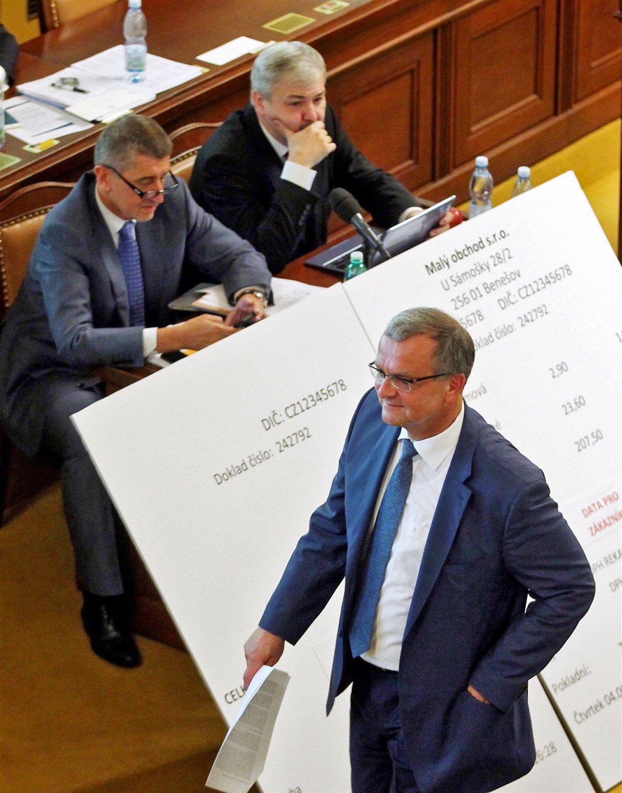Pak přišel další prvek parlamentní show. Šéf hnutí ANO si totiž s sebou přinesl dvě obří makety účtenek, se kterými chodil po Sněmovně. Ukázal je nejprve poslancům ODS a TOP 09, pak si s nimi stoupl před Kalouska a šel s nimi i před poslance ČSSD a KSČM. Nakonec je postavil před řečnícího šéfa poslanců TOP 09. Ten si pak dokonce vzal pauzu na rozmyšlenou s odůvodněním, že je ve Sněmovně velký hluk.