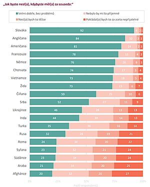 Hůře by nesli příchozí z Blízkého východu (například Afghánce či Syřany) nebo Afriky. Mít za souseda někoho z těchto zemí by dokázala zhruba čtvrtina dotázaných. Přijetí jiných národností, zejména východních států, jako jsou Saúdové, Afghánci, Syřani, Iráčani, zůstává dlouhodobě na nízké úrovni.