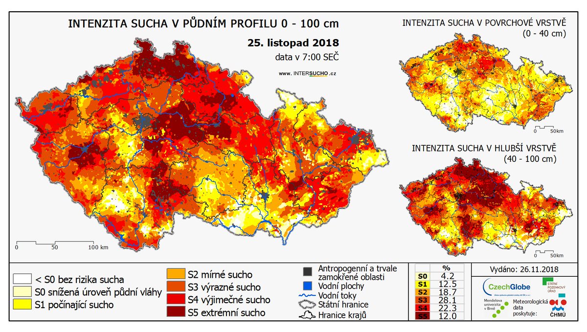 Problém je zejména v hlubších vrstvách půdy, tedy mezi 40 až 100 centimetry pod povrchem. „Přeci jen jsme nějaké srážky v září měli, což vedlo k částečnému doplnění vody v prvních deseti-dvaceti centimetrů. Níže je však na většině území velké sucho. Vypovídá to o tom, že ty srážky nepronikly hlouběji, nebylo jich dost,“ uvedl Žalud. Voda tak například nemohla proniknout ke kořenům stromů.