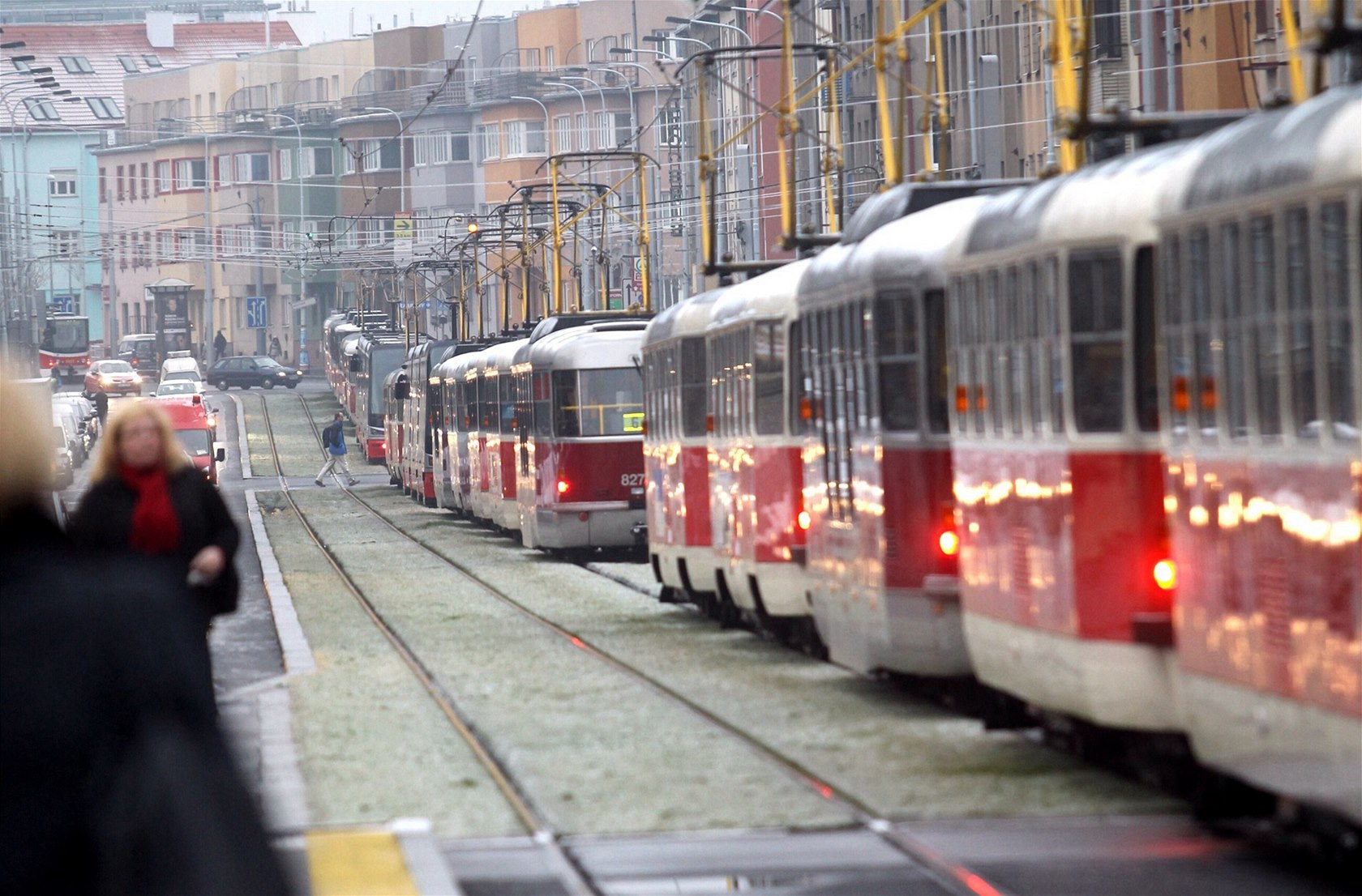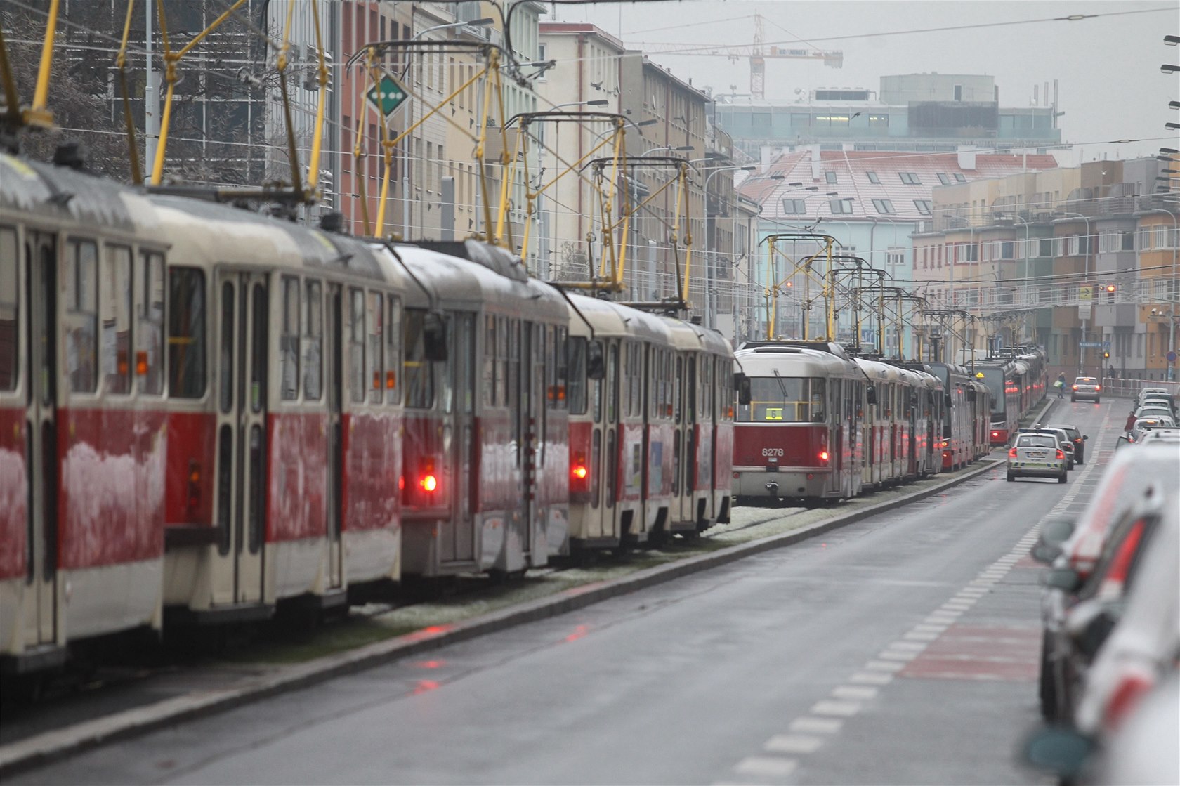 Dopravní kalamita v pražské ulici Vršovická (2. 12. 2014).