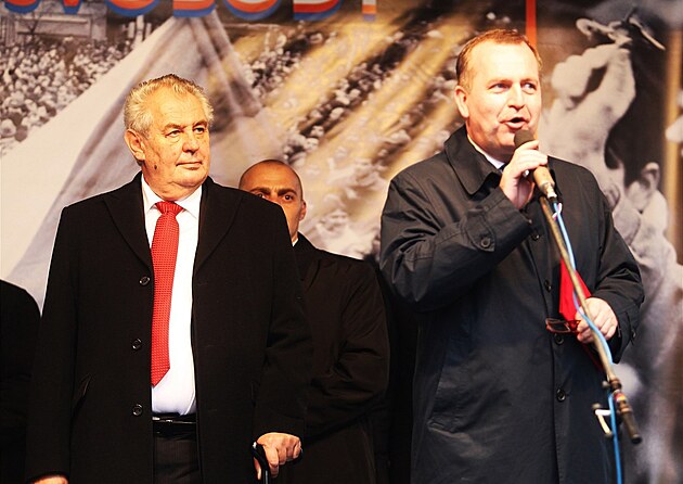 Prezident Miloš Zeman a rektor Univerzity Karlovy Tomáš Zima při proslovu na Albertově (24. 11. 2014).