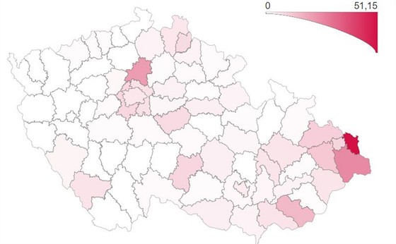 Na Mělnicku za uplynulý týden zaznamenali zhruba 21 nových případů na 100 000 obyvatel, v okrese žije zhruba 109 000 lidí. Před Mělnickem je v tomto porovnání jen Karvinsko s 51 případy a Frýdecko-Místecko s 25 nově nakaženými na 100 000 obyvatel za posledních sedm dní. Uherskohradišťsko má za poslední týden téměř 15 nově nakažených na 100 000 obyvatel. Na Jihlavsku s ohniskem ve Větrném Jeníkově je to devět a na Kutnohorsku s ohniskem v Církvici už jen osm nových případů na 100 000 obyvatel za uplynulý týden. Hygienici proto v okrese Kutná Hora chtějí zmírnit mimořádná opatření.