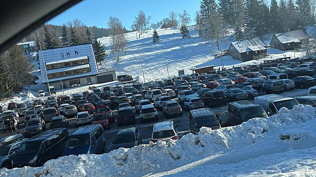 Auta lyžařů a turistů zaplnila také parkoviště v horském sedle u Šerlichu v Orlických horách. Policisté všem doporučují, aby parkovali v Deštném v Orlických horách a využívali kyvadlovou dopravu.