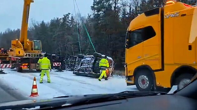 Počasí dál komplikovalo dopravu i krátce před desátou hodinou. Na 11. km se srazila dodávka s osobním autem. Na 45. km ve směru na Prahu dálnici uzavřelo vyprošťování kamionu.