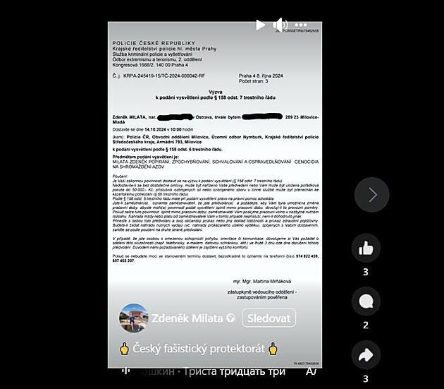 Jenže doma Milata čelí vyšetřování kvůli možnému spáchání trestného činu – Popírání, zpochybňování, schvalování a ospravedlňování genocidia. Před několika dny Deník.cz upozornil na to, že Milata se v půlce prázdnin zúčastnil v Praze shromáždění na protest proti besedě ukrajinských vojáků se svými krajany žijícími v Česku.