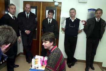 Ochranka střežila v budově ČT na Kavčích horách v Praze vchod do zpravodajského velína, ve kterém je 50 zaměstnanců neuznávajících zvolení nového generálního ředitele Jiřího Hodače. Bezpečnostní služba omezovala pohyb revoltujících zaměstnanců a dovnitř odmítala vpustiti novináře z jiných médií. (1. ledna 2001) |