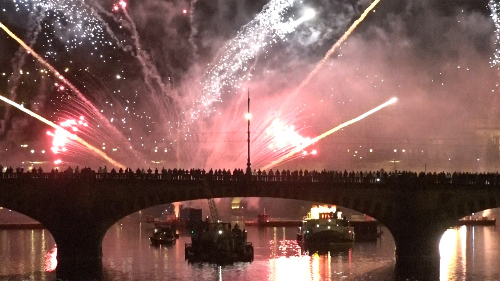 Ohňostroj se za doprovodu hudby odpaloval z pontonů umístěných mezi Karlovým mostem a Střeleckým ostrovem. Na řece stála i loď se zástupem svítících barevných figur připomínajících slavnou čínskou terakotovou armádu.