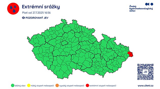 Nejvyšší stupeň nebezpečí platil v neděli večer zhruba na hodinu pro oblast Jesenicka, kde hrozily extrémní srážky. Předtím zhruba v 08:30 ČHMÚ uvedl, že na Jesenicku spadlo za uplynulých šest hodin až 50 milimetrů srážek.