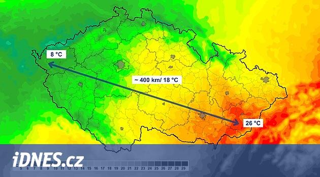 Na Vsetínsku či Zlínsku naměřili meteorologové přes letních 25 °C. Naprosto odlišné je počasí na západě republiky. V Karlovarském kraji je zataženo, prší a teploty se drží okolo 8 °C. Teplotní rozdíl tak dosahuje na přibližně 400 km až 18 °C.