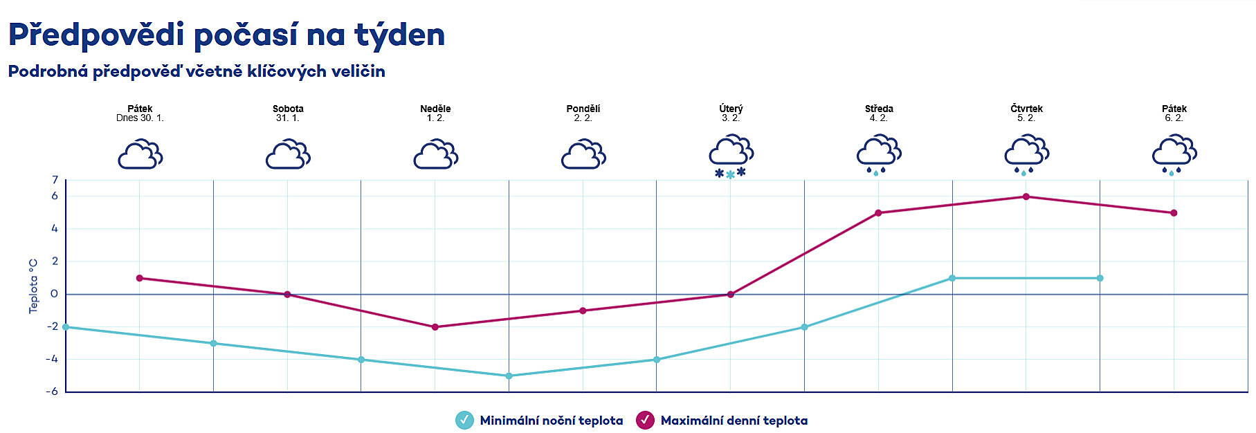 | sobota 31. ledna | -1 až -5 °C | -1 až +3, na SV -4 až -1 °C |