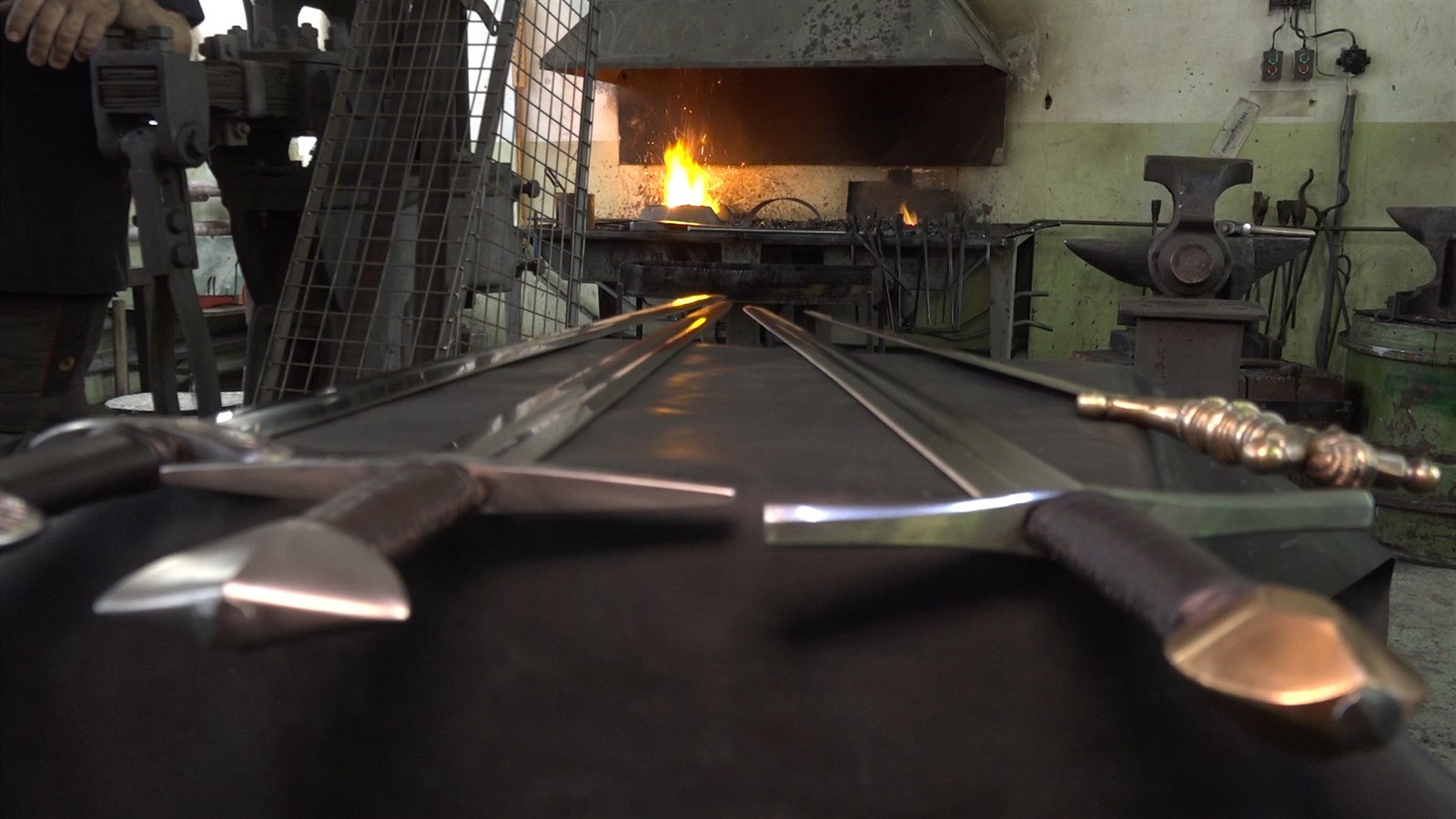 Vítá nás vedoucí zdejších kovářů Ondřej Piskáček, který nás provádí kolem roztopené výhně, brusek a automatických bucharů. Ten největší má na sobě nápis „Hulk“ a záhy se přesvědčujeme, jak příhodná je to přezdívka. Piskáček jej zapne a mechanická kladiva se dají do ohlušujícího tvarování rozžhaveného železa, která mezi ně kovář vkládá. Hulk pomáhá především s tvarováním záštit, jež na meči chrání ruku šermíře.