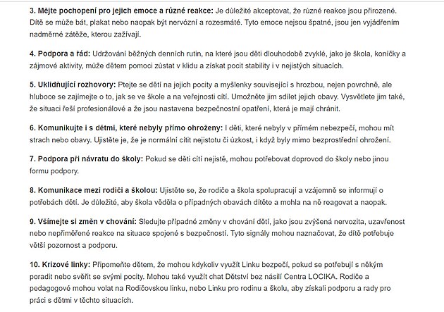 Vedle toho pokyny radí, jak o celé záležitosti mluvit s dětmi. „Jeho cílem je poskytnout jim konkrétní návod, jak s dětmi komunikovat, jak podpořit jejich psychickou pohodu a jak zajistit, aby se děti cítily bezpečně a stabilně i v nejistých situacích,“ píše se v dokumentu, který obsahuje několik bodů.
