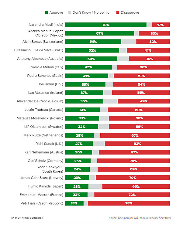 Podle průzkumu společnost Morning Consult, která sleduje hodnocení vládních představitelů v několika desítkách zemí, českého premiéra podporuje pouhých 18 procent vlastních spoluobčanů. Naopak 78 procent s jeho vládou vyjadřuje nesouhlas. Data sesbíraná za poslední necelé dva roky naznačují, že Fialova popularita klesá dlouhodobě.