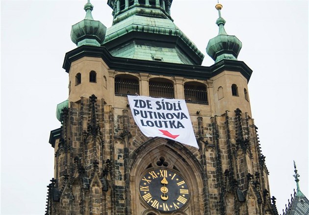 V neděli v poledne se katedrála stala symbolem protestu proti prezidentovi Miloši Zemanovi. Skupina aktivistů oMEN rozvinula z Velké jižní věže směrem ke třetímu nádvoří transparent „Zde sídlí Putinova loutka“, opatřený dolů směřující šipkou.