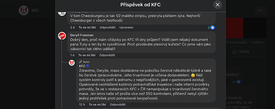 Na reportáž reagovali lidé na sociálních sítích a KFC se snažilo obavy vyvracet. „Maso dostáváme na pobočku čerstvé několikrát týdně a také ho čerstvé zpracováváme. Jeho trvanlivost je určena dodavatelem,“ stálo v jedné z odpovědí zákazníkům.