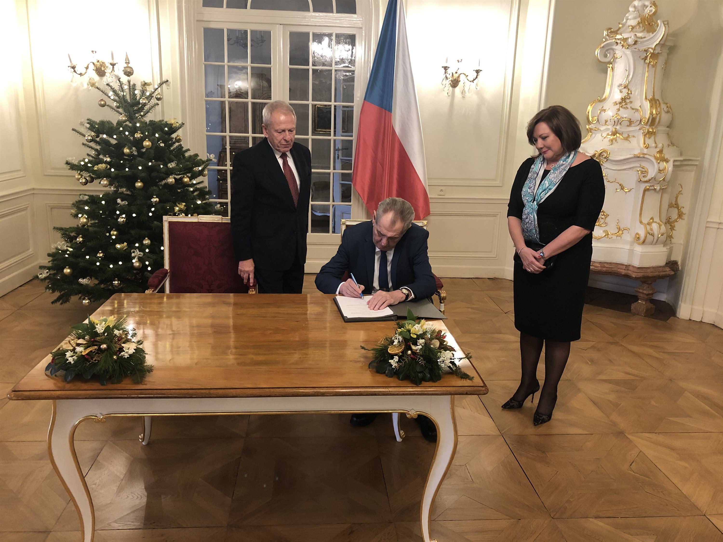 Prezident republiky Miloš Zeman podepsal ve čtvrtek dne 19. prosince 2019 těchto šest zákonů:1. zákon ze dne 11. prosince 2019, kterým se mění zákon č. 262/2006 Sb., zákoník práce, ve znění pozdějších předpisů, 2. zákon ze dne 11. prosince 2019 o právu na digitální služby a o změně některých zákonů, 3. zákon ze dne 11. prosince 2019, kterým se mění zákon č. 383/2012 Sb., o podmínkách obchodování s povolenkami na emise skleníkových plynů, ve znění pozdějších předpisů, a zákon č. 458/2000 Sb., o podmínkách podnikání a o výkonu státní správy v energetických odvětvích a o změně některých zákonů (energetický zákon), ve znění pozdějších předpisů, 4. zákon ze dne 11. prosince 2019, kterým se mění zákon č. 435/2004 Sb., o zaměstnanosti, ve znění pozdějších předpisů, 5. zákon ze dne 11. prosince 2019, kterým se mění zákon č. 406/2000 Sb., o hospodaření energií, ve znění pozdějších předpisů, a 6. zákon ze dne 17. prosince 2019, kterým se mění zákon č. 117/1995 Sb., o státní sociální podpoře, ve znění pozdějších předpisů. |