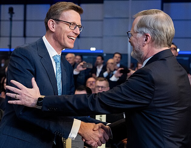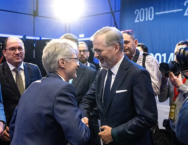 Nový předseda ODS Martin Kupka přijímán gratulaci od svého předchůdce v čele strany, expremiéra Petra Faily.