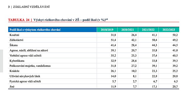 Ve výroční zprávě „Kvalita vzdělávání v České republice“ České školní inspekce se však mimo jiné píše, že za uzavřený školní rok 2022 a 2023 téměř u všech sledovaných forem rizikového chování zaznamenaly školy nárůst jeho výskytu.