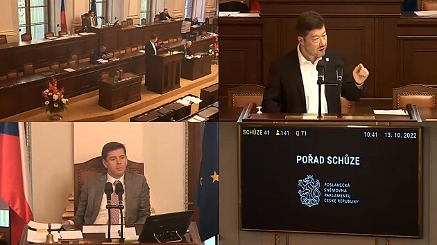 Slovo si vzal kolem desáté hodiny šéf SPD Tomio Okamura a od té doby nepustil nikoho tři hodiny nikoho ke slovu. Dal najevo, že je připraven i na noční jednání a že nechce připustit, aby vládní koalice změnila způsob volby členů Rady ČT a Rady Českého rozhlasu.