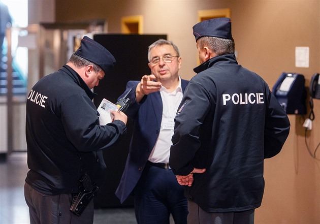 Tajemník SPD Jaroslav Staník (uprostřed) nechal přivolat policii, aby odvedla některé novináře. Ti se u vchodu dožadovali informace, proč jim byla na poslední chvíli zrušena akreditace. (21. října 2017)