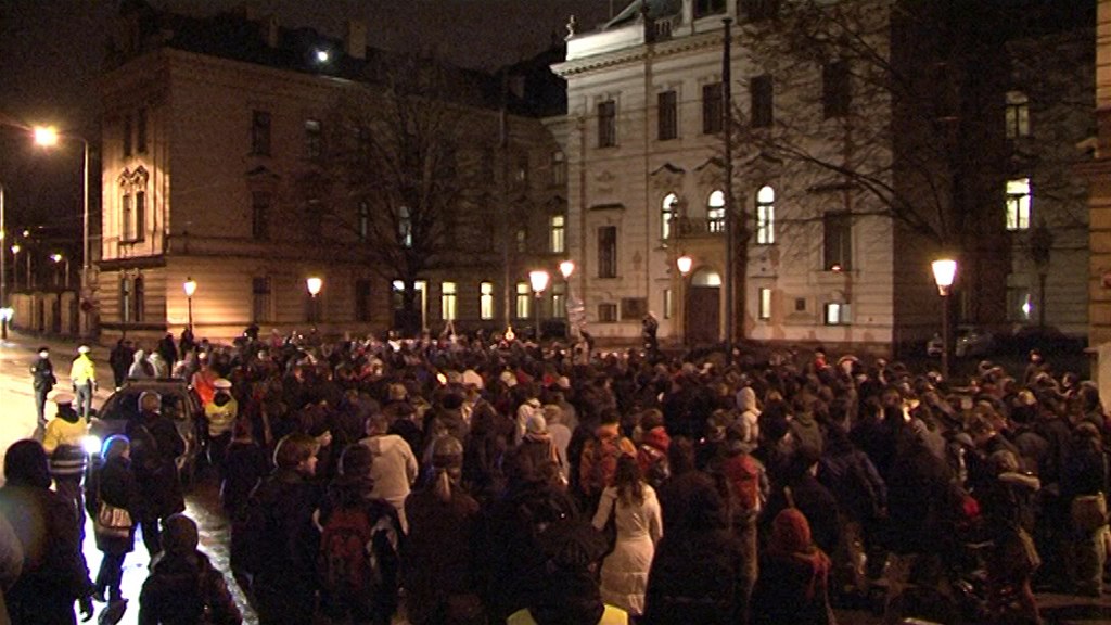 V 18:30 se zhruba 150 studentů sešlo před Právnickou fakultou UK. V rukách měli lampiony či transparenty s nápisy "Vyjedou blaničtí rytíři?", "Hrrr na ně". Z megafonu zazněly protireformní projevy. Řečníci také účastníky akce vyzvali, aby následný průvod byl slyšet, ale zároveň se odehrál bez incidentů.